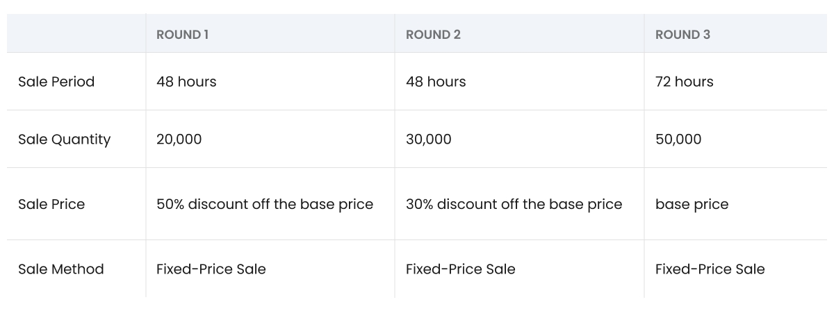 The sale period is 7 days from the date of move-in, with a total of 3 rounds: the first round lasts for 48 hours, the second round lasts for 48 hours, and the third round lasts for 72 hours. The sale price is based on a base price set by Alt, with the first round offering a 50% discount off the base price, the second round offering a 30% discount, and the third round selling at the base price.